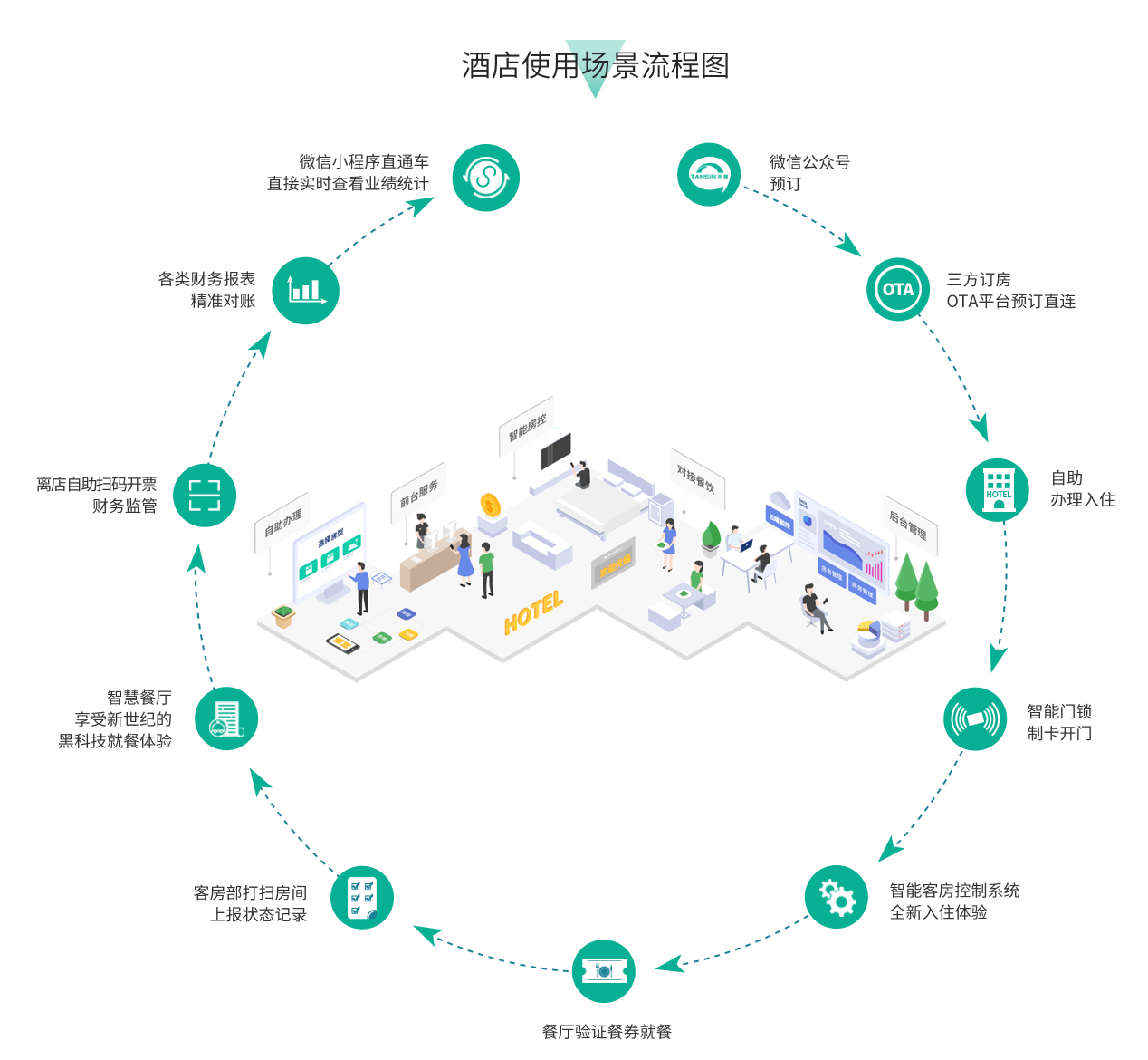 將酒店運營完全接入互聯網,數據可實時查看,手機端、三方訂房平臺、營銷、會員等各項酒店黑科技無死角全打通。